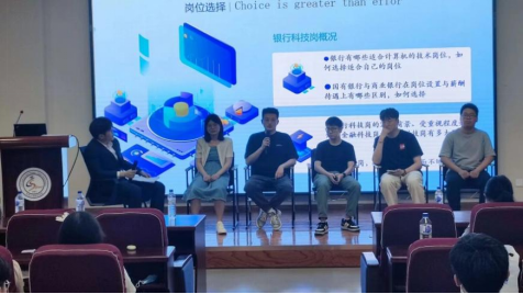 在五位学长学姐的细致分享后,本场活动的第二部分“交流解惑”环节以交流座谈会的形式开展。座谈由研会综合事务部部员关振海同学主持,就“银行科技岗位概况”、“银行国企求职时间规划”、“笔试面试”等热点话题与五位学长学姐展开讨论。