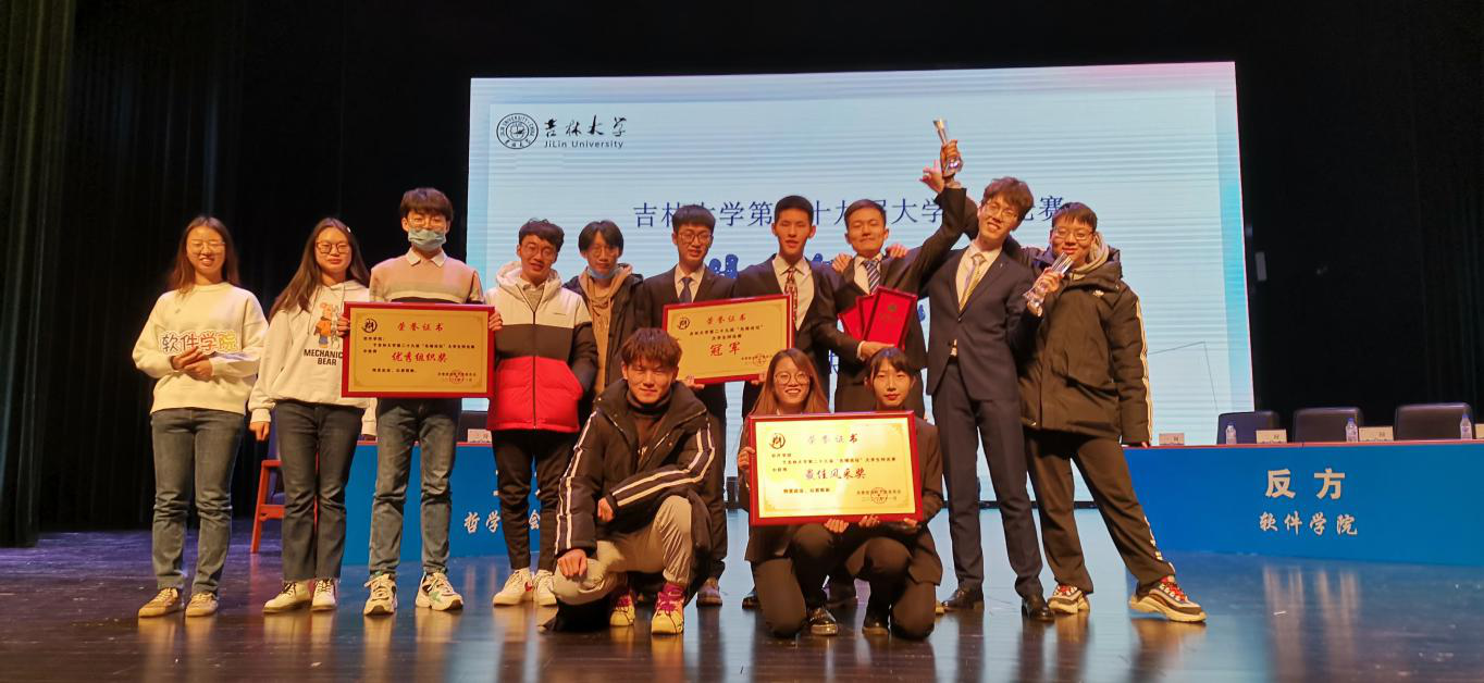 辩论队成功获得本次大赛的冠军奖牌,同时,张座明同学也获得了“最佳辩手”的奖杯。颁奖仪式结束后,辩论队的其他同学纷纷上台拥抱四位主辩手,大家在舞台上合影留念,体现了队员们的团结与友谊。