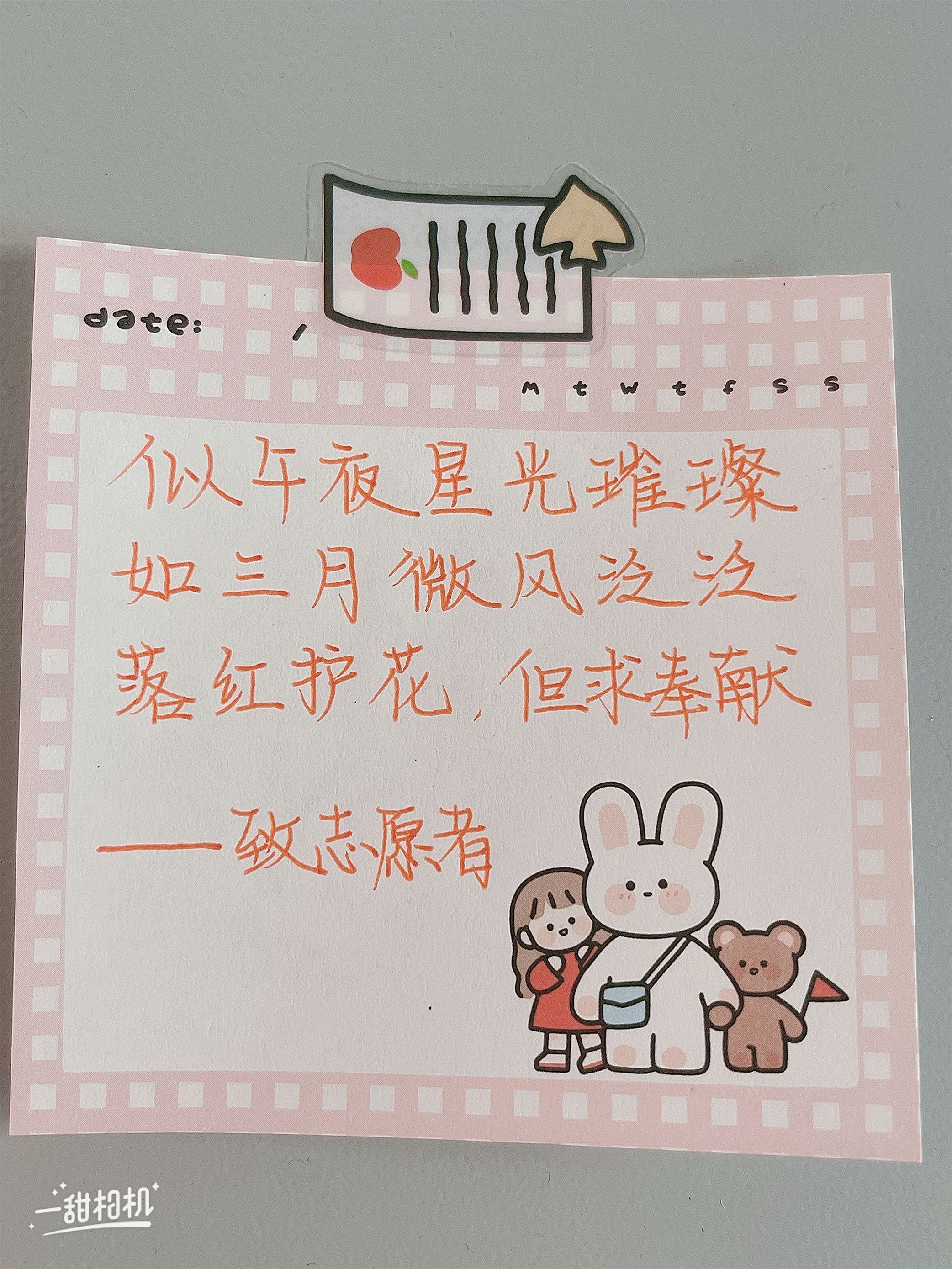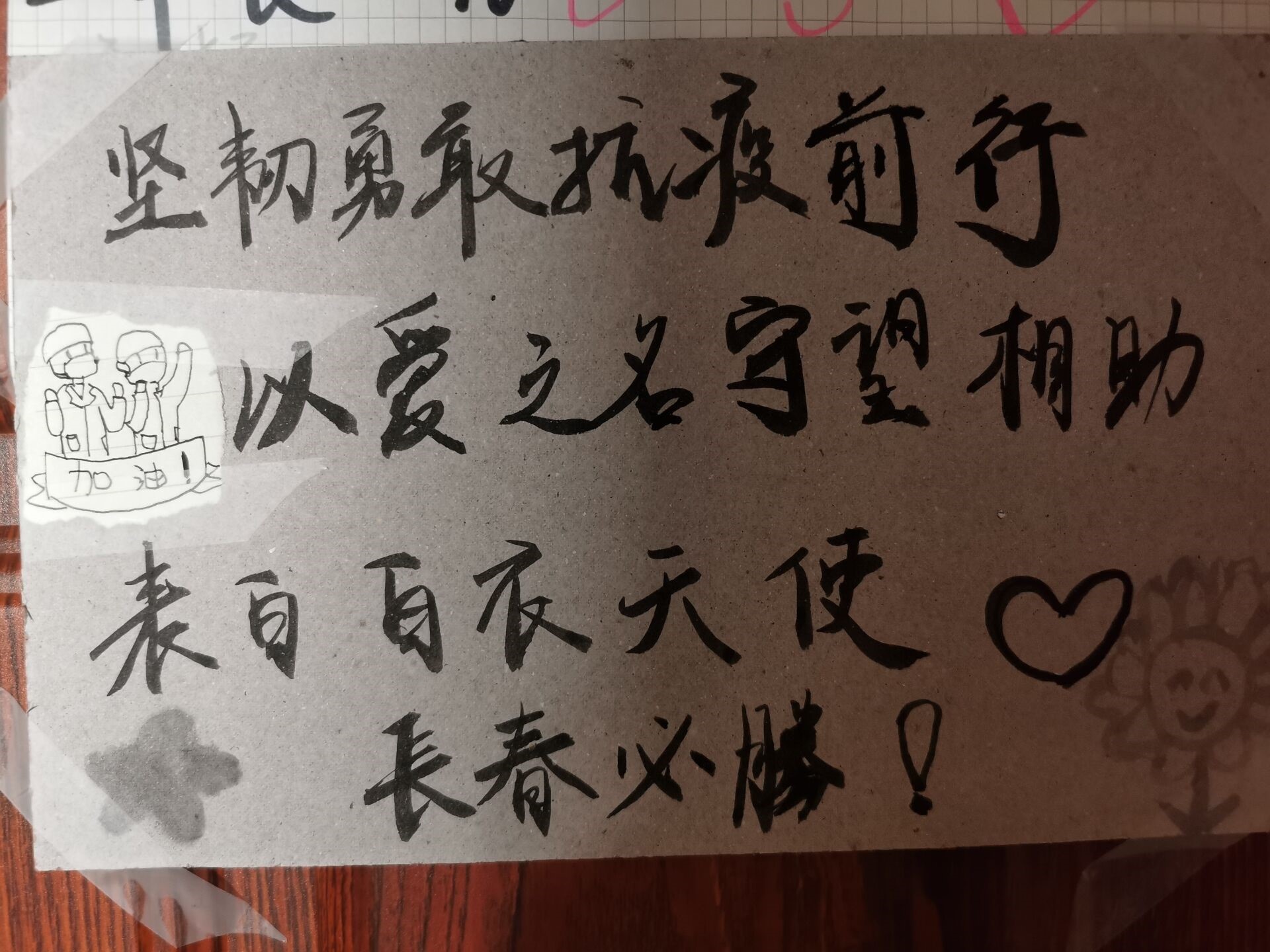 活动期间,同学们表现出了极大的参与热情,纷纷以寝室为单位,通过手写卡片并张贴的方式,将爱注于笔端。一条条诗文或寄语,表达了对奋战在疫情防控工作一线的志愿者最真诚的感激和祝福,蕴含了对美好未来的憧憬和祈盼,也赋予了志愿者强大的精神力量。