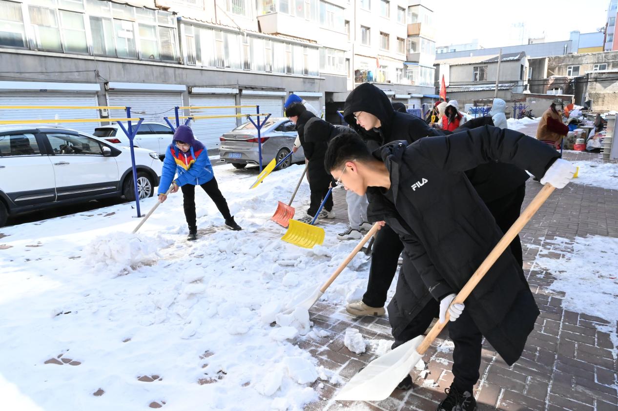 的同学们依然充满活力,热情投入到清扫冰雪的志愿服务行动中,历经了数个小时的分工合作和努力劳动,同学们终于将对应区域的冰雪清扫干净,得到了社区工作人员及居民的一致认可和高度赞扬。
