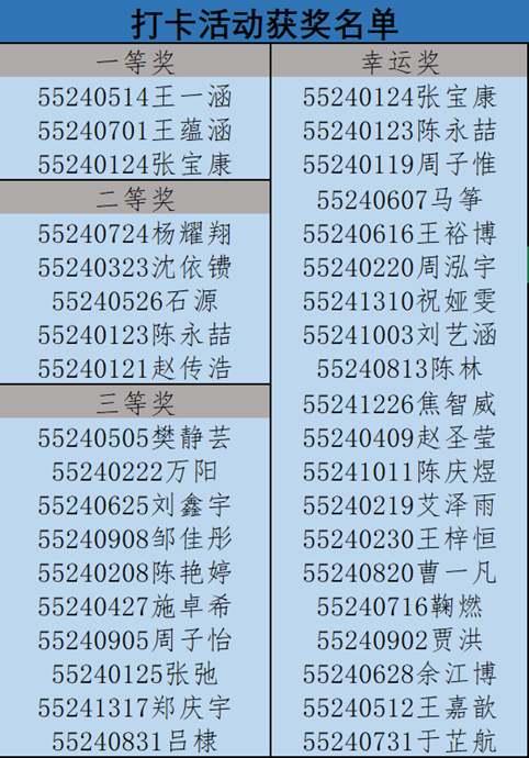 为鼓励自律和努力,活动设置了丰厚的奖励机制,包括一等奖、二等奖和三等奖。最终,根据打卡的时长与质量,18名同学脱颖而出,被评为“自律模范”。此外,活动还设立幸运奖,为积极参与的同学送上祝福,进一步激发学习热情。