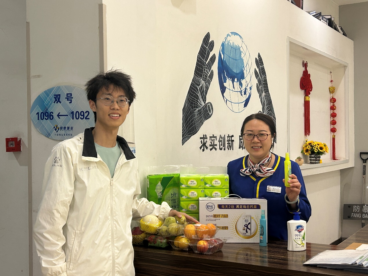 团委实践部组织开展“感恩后勤,温暖人心”主题活动。学生代表前往北苑学生一公寓看望坚守岗位的宿舍管理员,并送上水果、牛奶等慰问品,表达诚挚的敬意与感谢。