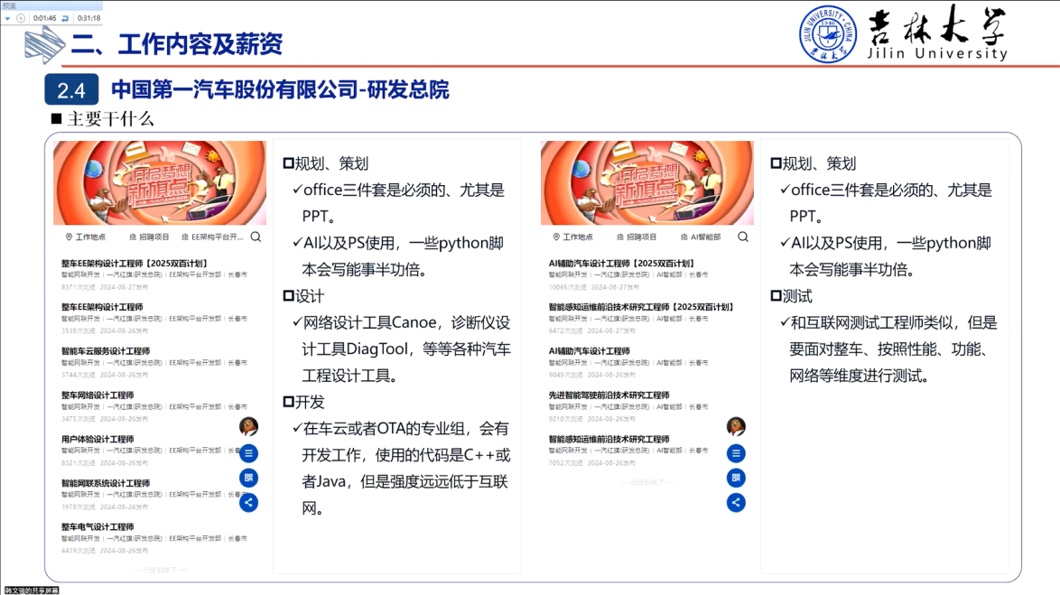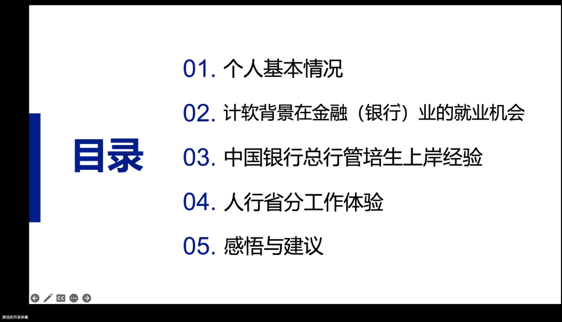 研究生会主持人逐一介绍四位分享嘉宾:互联网领域优秀校友代表吕浩、渤海银行及一汽集团职业发展校友代表韩文强、中国银行与人民银行从业者薛浩,以及就职于烟草系统的盛建华。韩文强同学以“国企职业选择与价值实现”为主题,结合自身在一汽集团的工作经历,剖析了国企的工作环境、薪资待遇与职业发展路径,并分享了如何在薪资稳定性与个人成长空间之间权衡的思考。薛浩同学聚焦金融行业,从银行笔试高频考点到国企人际关系处理技巧,层层拆解非技术岗位的求职策略。吕浩同学系统梳理了互联网行业的技术能力要求与面试核心逻辑。他通过对比不同规模企业的招聘偏好,指出“技术深度与业务理解力并重”是突破大厂门槛的关键。盛建华同学以烟草系统为例,详细分析了垄断行业的招聘特点与职业稳定性优势,为追求“work-life balance”的同学提供了新思路。