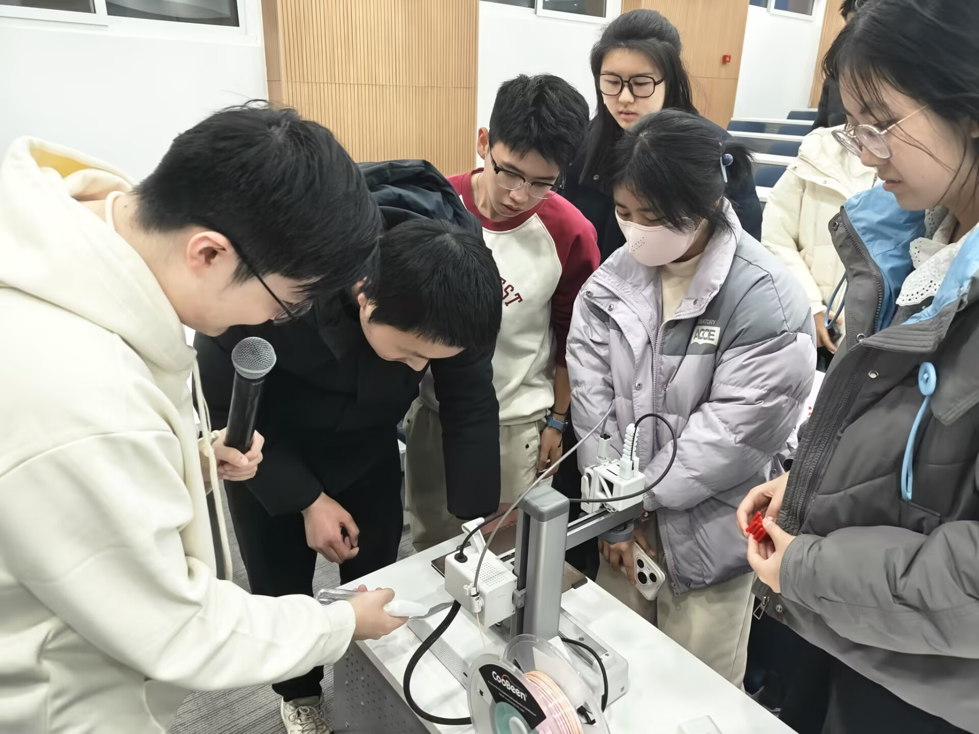 本次分享会紧扣实操应用,兼顾理论知识与实践展示,内容贴合同学们的学习需求与科创入门实际。王福峥结合自身技术积累,围绕3D打印的主流技术类型、热熔3D打印机核心构造、标准操作流程、实际应用场景、常见问题排查及新手入门指南等核心内容,展开条理清晰、深入浅出的讲解。活动现场同步开展实时打印演示,让在场同学直观见证3D打印的完整运转流程,将抽象技术原理转化为具象实践展示,帮助同学们快速搭建起对3D打印技术的系统认知,夯实科创知识根基。
