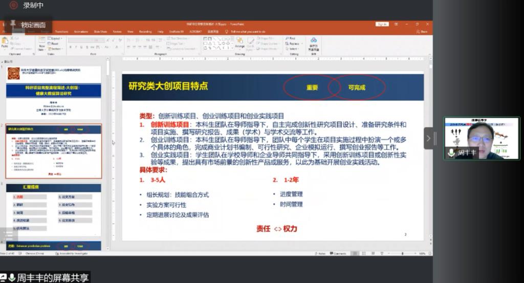 教授、博士生导师周丰丰为同学们带来了以“研究类大创项目全流程规划”为主题的腾讯会议直播讲座。首先,周丰丰老师为大家简要介绍了研究类大创项目的整体规划和时间节点。接下来,周丰丰老师以科研项目选题的可行性为切入点,结合实验室发表文章的实例为同学们详细讲解了论文选题、调研、复现、改进结果、优化算法、论文方案、论文写作、投稿审稿等环节的注意事项。周丰丰老师建议大家在研究工作中培养严谨的工作态度和良好的工作习惯,如遇退稿要认真回复编辑和审稿人的所有意见,如暂离工作要做好文档、论文或实验数据的保存备份,切莫因小失大。最后,周丰丰老师表示良好的开端是成功的一半,希望大家多做研究、多发论文。