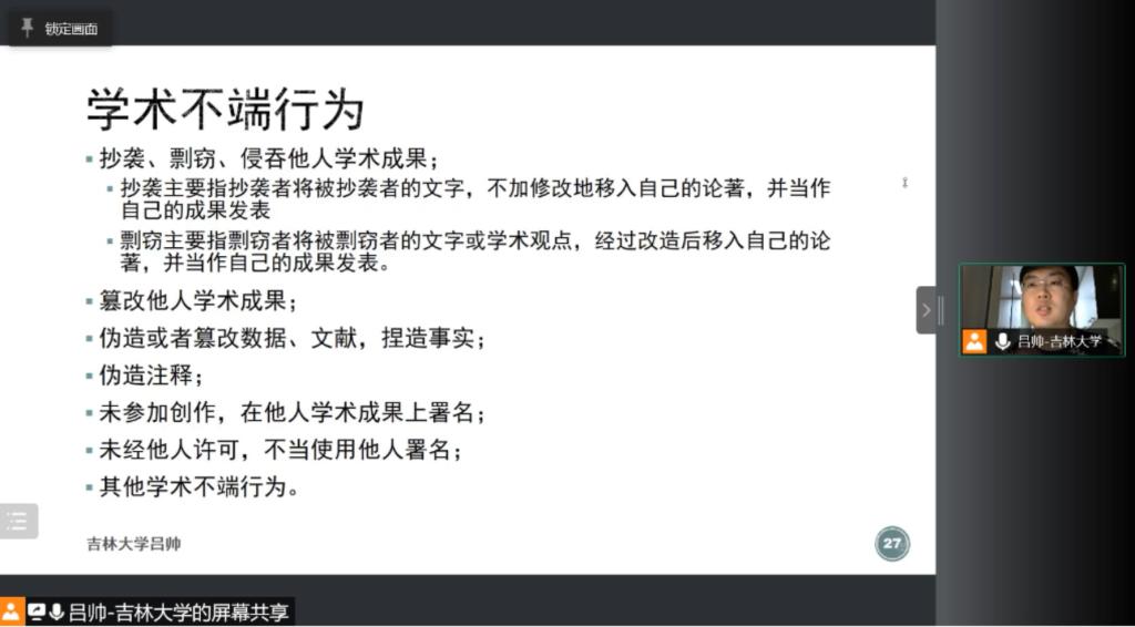 副教授吕帅首先向同学们介绍了大创项目的申报流程,并对立项前后的组队及执行等环节给出了几点建议。吕帅老师列举入选国家级项目清单向大家讲述了大创选题的方法和重要性,然后以创新训练项目为例对申请书中国内外研究现状分析与评价、研究内容、特色及创新点、申请理由、实施方案、进度安排、所需资源、经费预算和预期成果等九大要素的主旨、注意细节及避免问题进行了细致阐述。接着,吕帅老师对比期刊论文和会议论文详述了两者在写作、投稿及评审流程中的注意事项,同时详解了学术不端行为的认定标准。讲座最后,就论文一作和通讯作者人选等问题吕帅老师与同学们进行了线上交流。