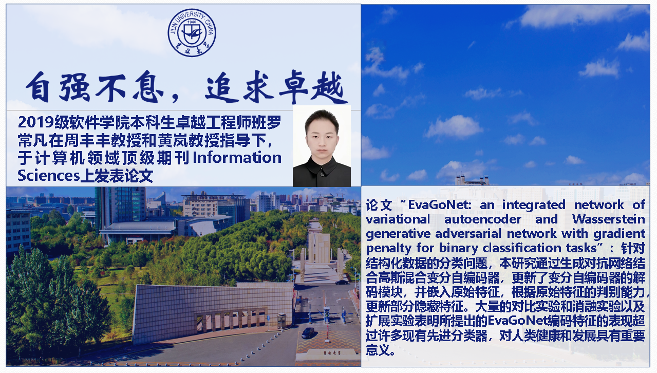 本科生邵永康,计算机学院本科生王子涵、胡剑铮、袁佳蔚)在2020年暑假进入2019级卓班班主任周丰丰教授的健康信息实验室开展大数据算法研究。整个暑假以及后面的时间里,该小组都在周教授的指导下刻苦探索相关算法的改进工作,每周不少于三次的组会讨论,超过了不少研究生的科研刻苦程度。该研究成果经历了多个顶会的一轮评审,遗憾被拒。但是该小组成员坚持不懈,反复修改完善,最终见证了该篇论文“EvaGoNet: an integrated network of variational autoencoder and Wasserstein generative adversarial network with gradient penalty for binary classification tasks”在计算机领域顶级期刊Information Sciences上发表。该工作还受到黄岚教授的悉心指导。2019级卓班在全班同学的努力下,荣获麻豆影视